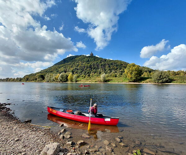 Direkt in der Flussschleife des Großen Weserbogens kann auf der Kiesbank angelandet und eine Pause eingelegt werden. Nach einer Stärkung geht es von hier aus zügig voran. Schon von Weitem kann man das Kaiserdenkmal und den Funkturm in Porta Westfalica erblicken.
